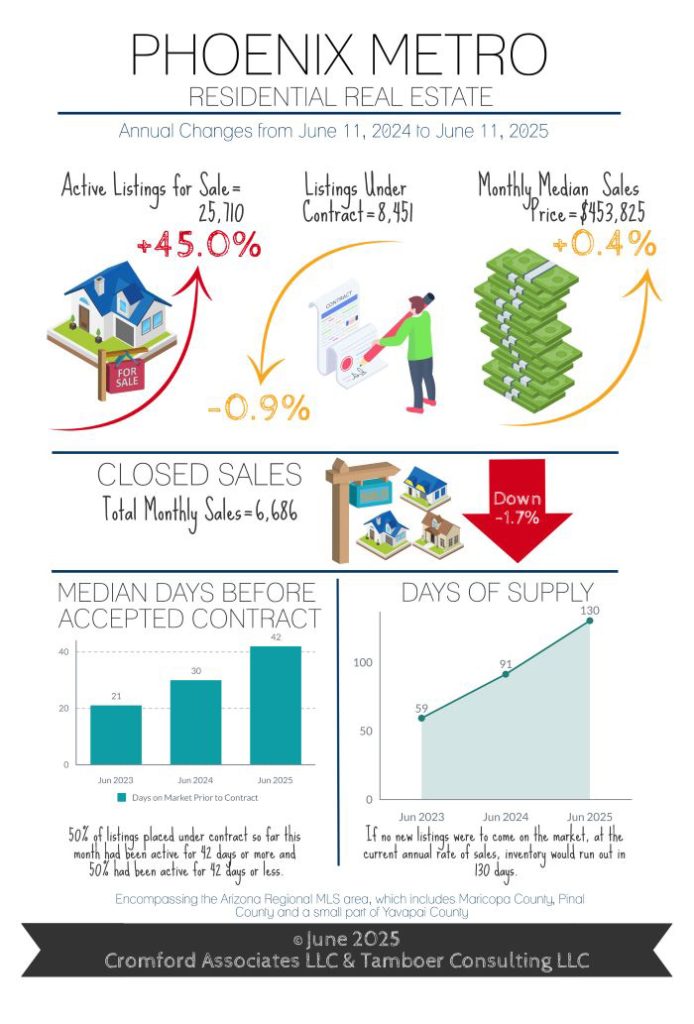 Meanwhile, Phoenix is entering its 8th month as a buyer’s market. Overall price appreciation is flat, within 1% of last year and lower than the 2.4% rate of inflation, with expectations that it may start gliding slowly down over the next few months. Affordable properties under $500K (which made up 58% of sales last month) have already seen prices drift down 2.2% year-over-year.