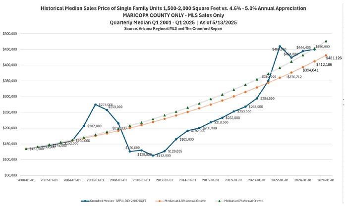 Questions persist about the degree to which Greater Phoenix homes are overvalued. To answer this, a basis must be established prior to the 2005-2008 bubble/crash and a “typical home” defined. The median home sold in Maricopa County was 1,600 sqft in 2000 and 1,900 sqft in 2025, so a single family home of 1,500-2,000 sqft is typical for this region. The annual appreciation rates from Q1 2001 thru Q1 2004 ranged from 3.6% to 5.3% with a median of 4.65%. The median rate across 25 years from Q1 2000 to Q1 2025 is 5.3%,(high of 32.9% and low of –41.4%). Extrapolating the 4.65% appreciation rate over 25 years supports a price correction of 3% by next year. However, one could argue that prices are currently in line with where they would’ve been with a 5% annual appreciation rate over 25 years, below the 5.3% long term median and are already undervalued.